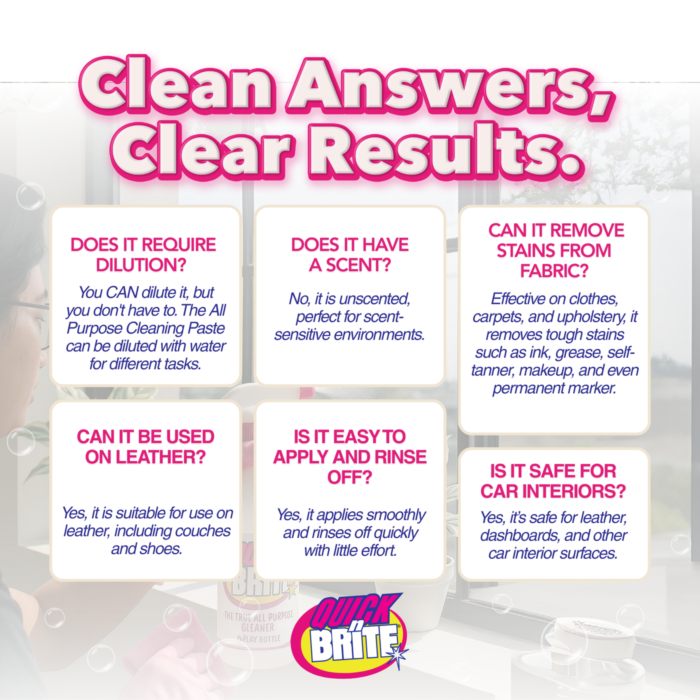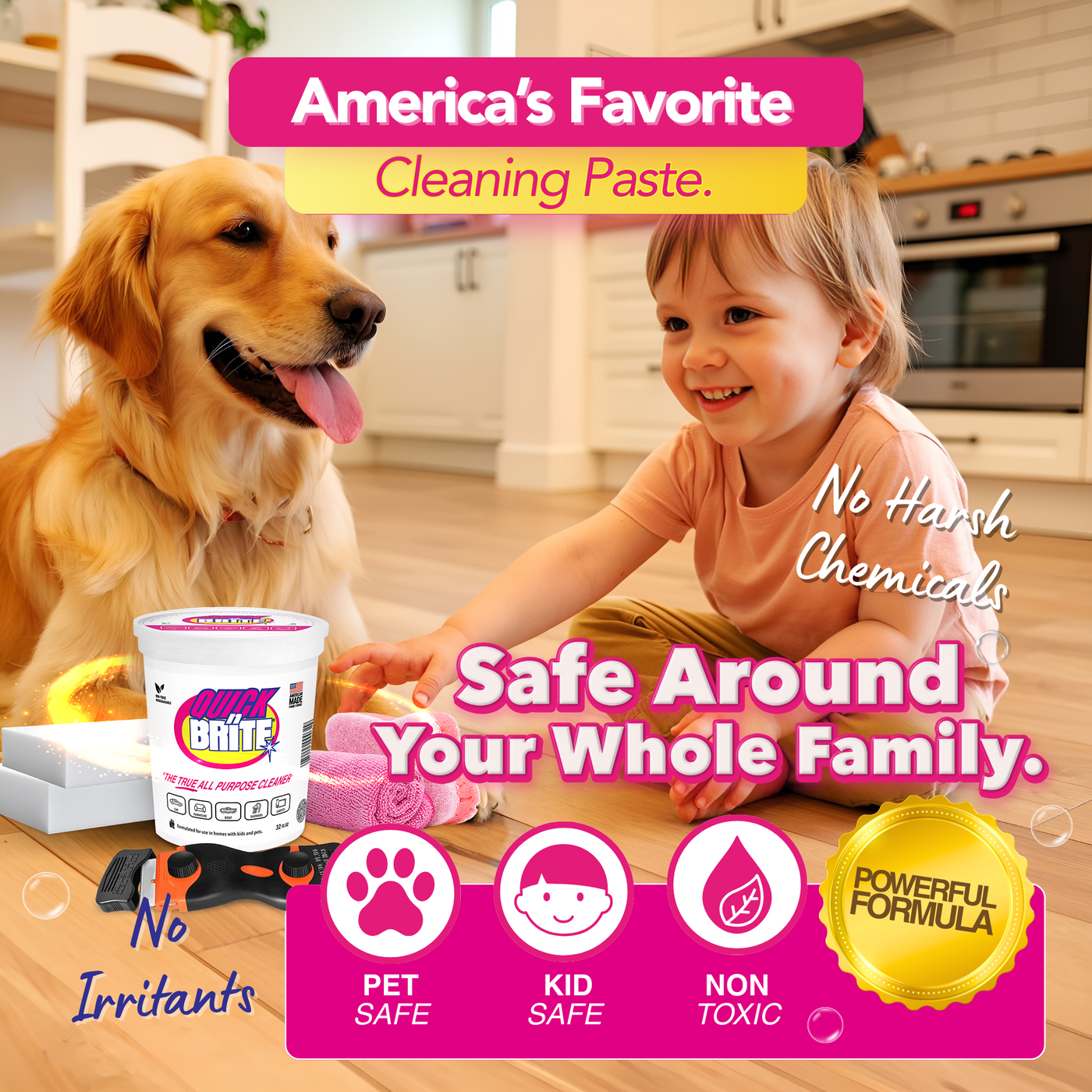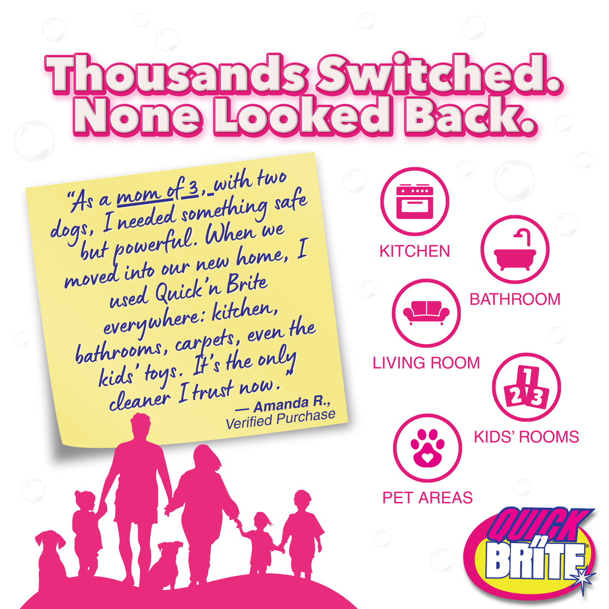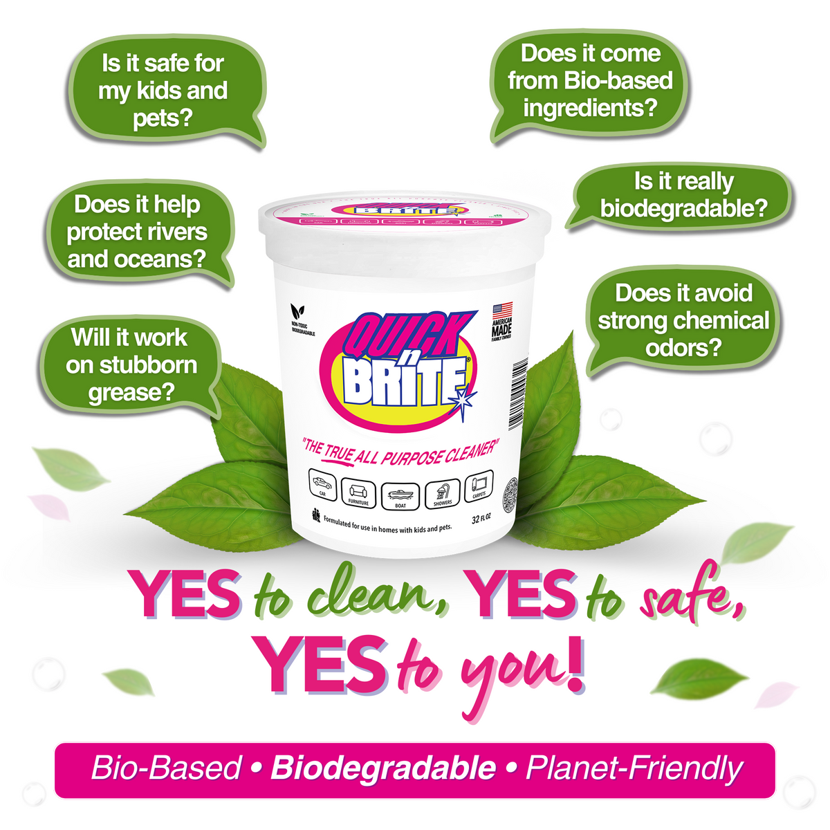 Yes, Quick’n Brite is safe to use around pets and children. Its non-toxic and biodegradable formula ensures that it cleans effectively without the harsh chemicals found in many other cleaners. This makes it a safe choice for households with young children and pets.