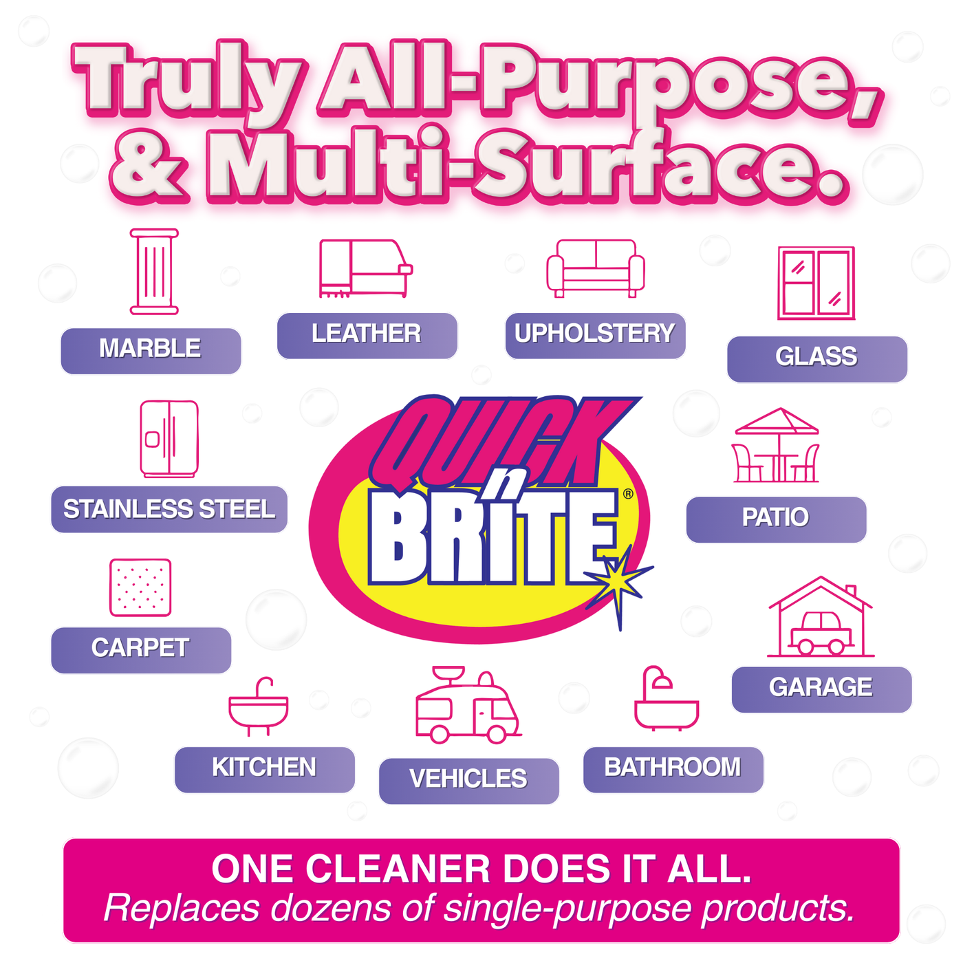 Quick'n Brite is a versatile cleaner that can be used on a wide variety of surfaces. Its non-toxic, biodegradable formula makes it safe and effective for many cleaning tasks both indoors and outdoors.